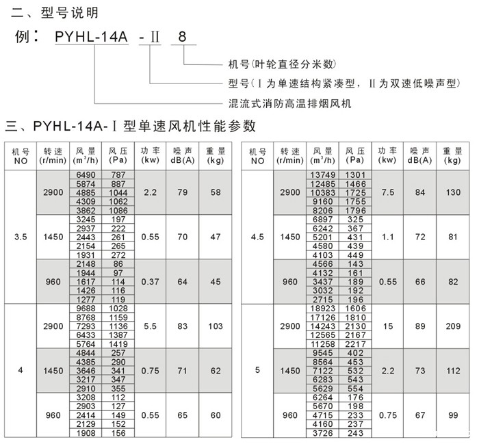 PYHL-14A系列排烟风机采用CAD软件多目标优化设计,选配模压扭曲翼形锥形叶轮,内置高温电机,配设专门的电机冷却系统。选用双速电机直联传动,达到一机两用(即平时送排通风和消防使用时高温排烟),配设电控箱后可远程自动控制。具有耐高温性能优良、风量大、、风压高、安装简便等优点,广泛应用于高层建筑、烘房、地下车库、地铁、隧道等场合消防排烟和送排通风。按GA211-1999消防见机耐高温试验方法,能在400℃高温条件连续运行100分钟以上,介质温度100℃条件下连续运行20小时/次不损坏,已被全国大城市消防部门认可采用。
