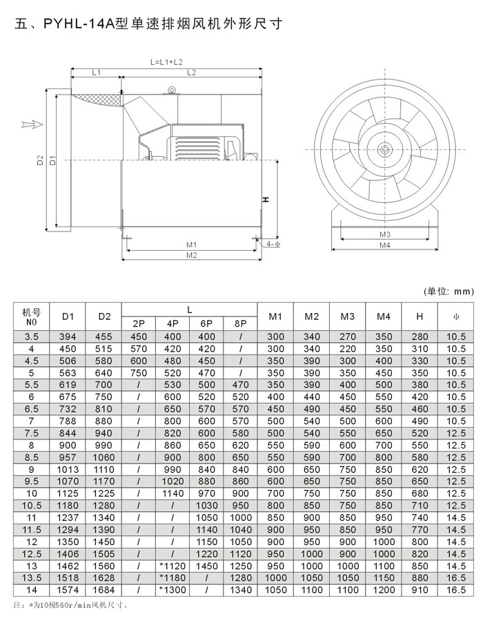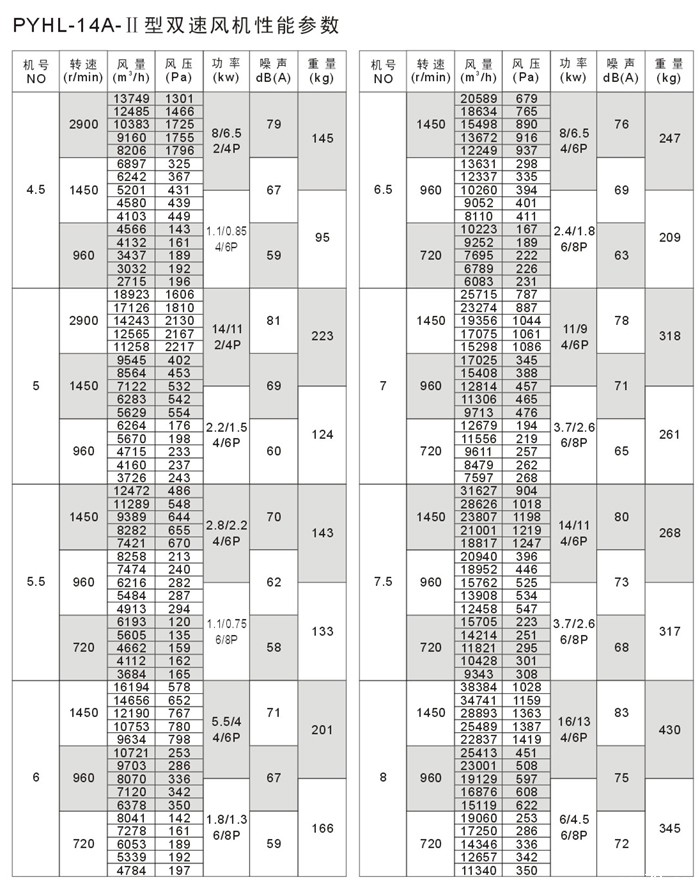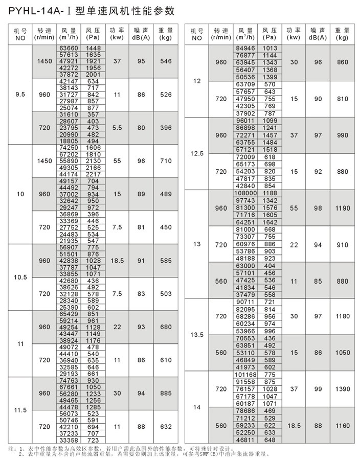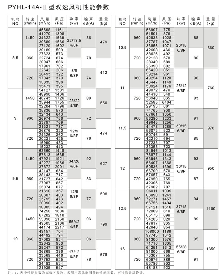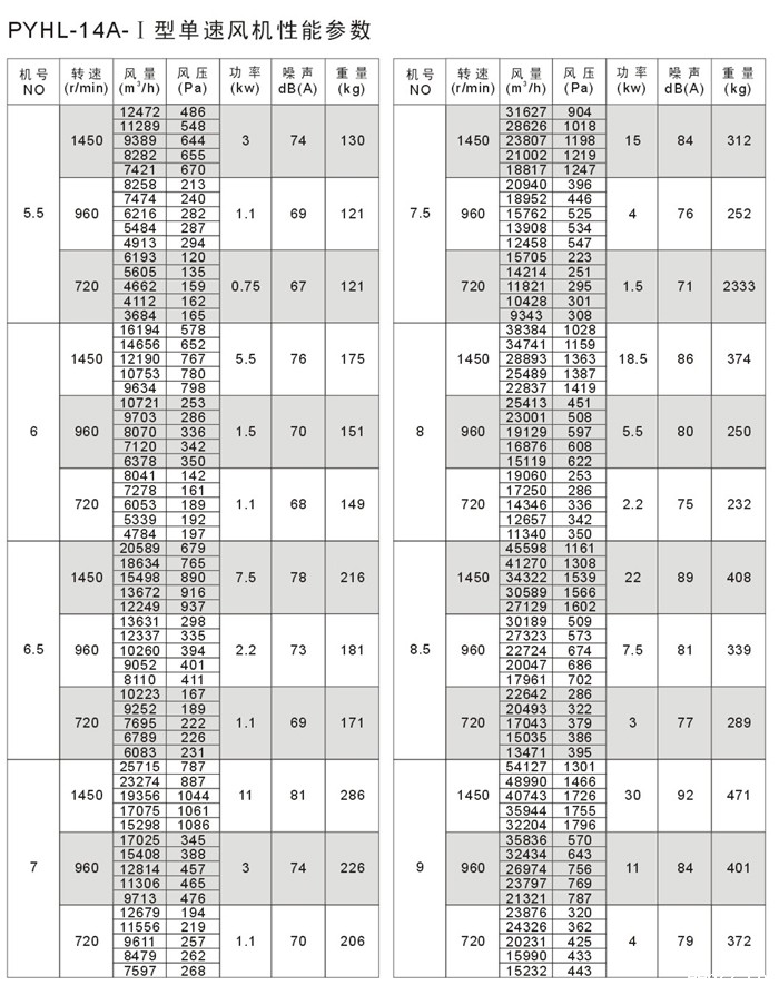 PYHL-14A风机Ⅰ型单速结构紧凑,节省安装空间。Ⅱ型双速在进风口设风口消声集流器,使风机在低速排风时运转噪音更低。