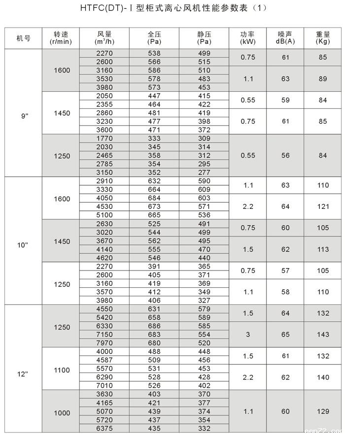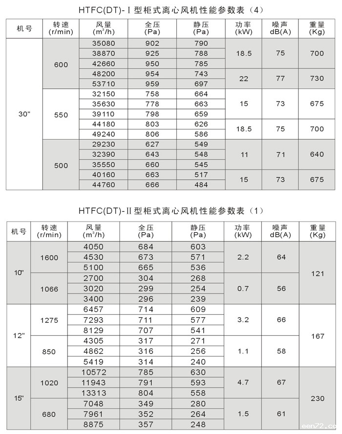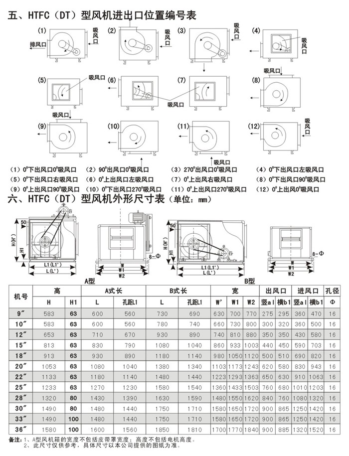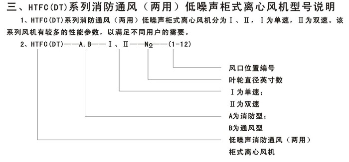 4、 HTFC(DT)系列低噪声消防通风(两用)柜式离心风机分为A型和B型两种类型,A型电机装在箱体外,用于消防排烟;B型电机装在箱体内,用于通风换气。