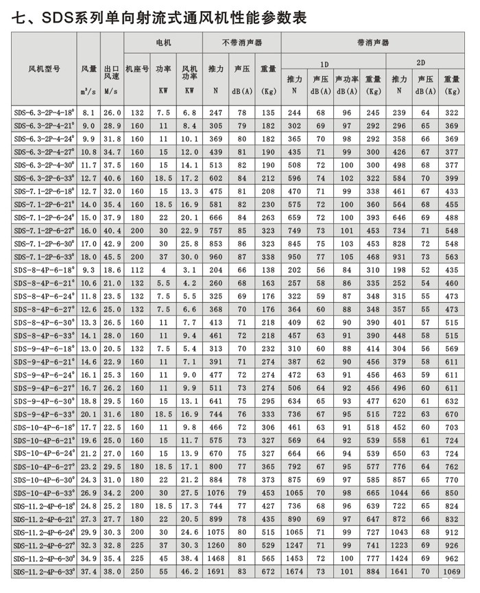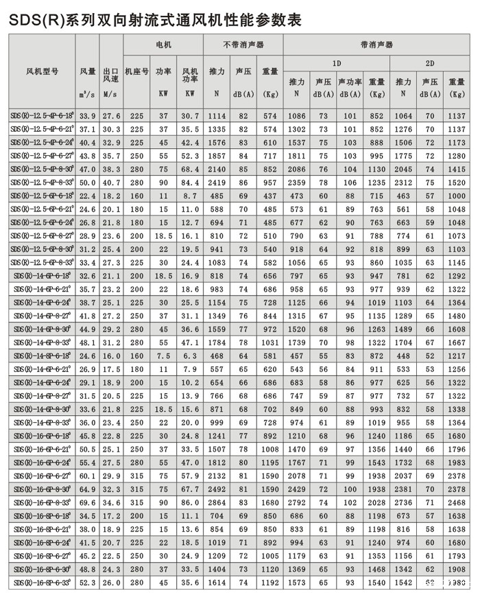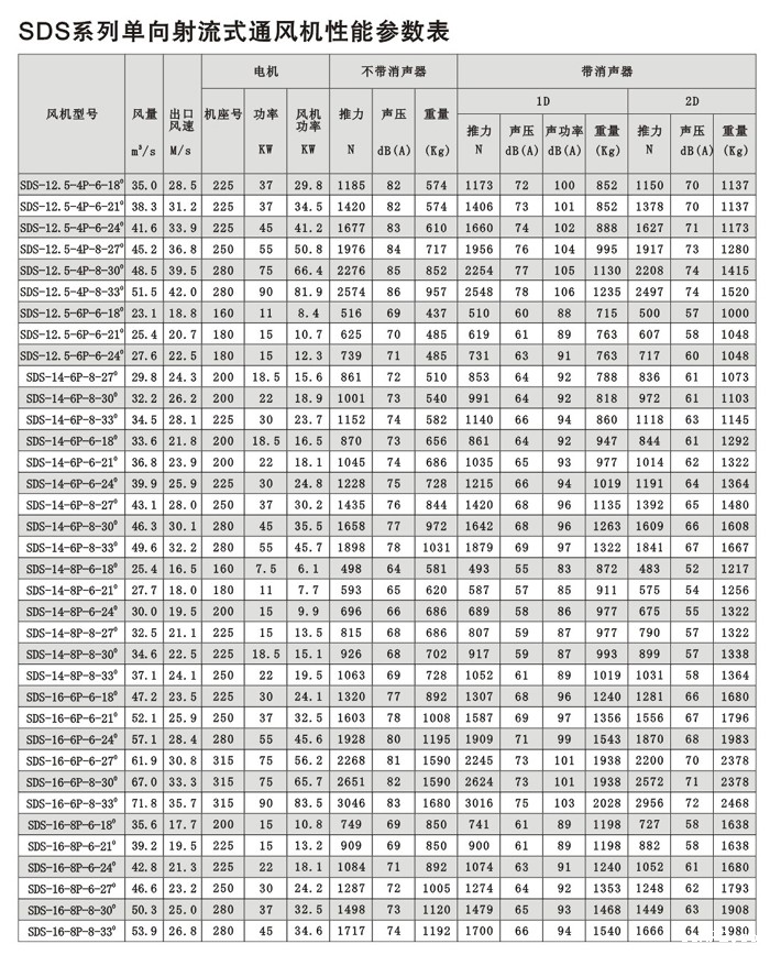 SDS系列射流风机规格自630mm~1600mm,分单向运转轴流风机和可逆式(双向)运转轴流风机二大类,最大推力有3500N,对任一负荷和工况均可选择高效、低噪声的风机。