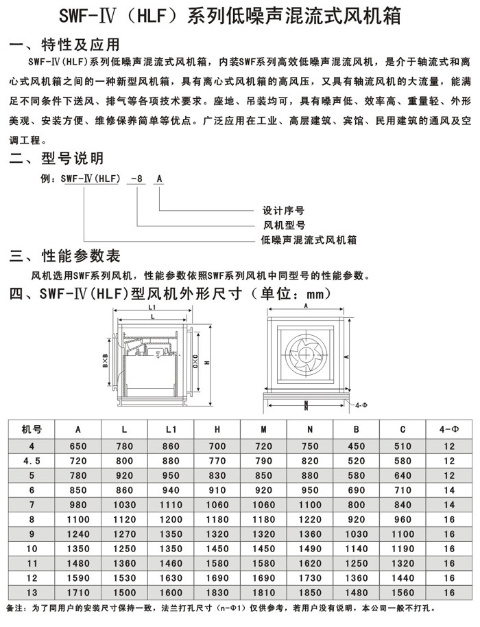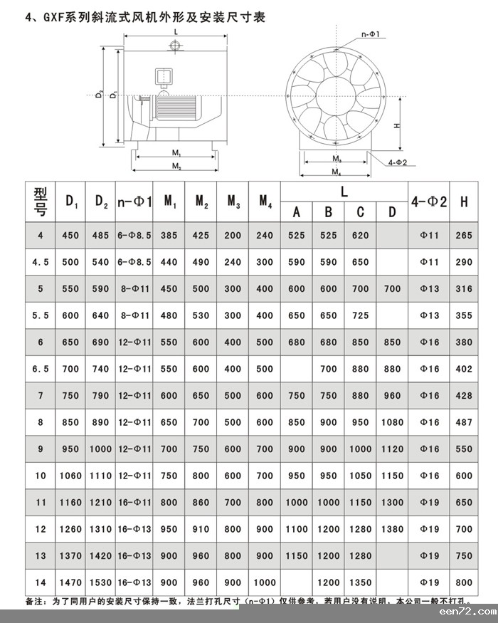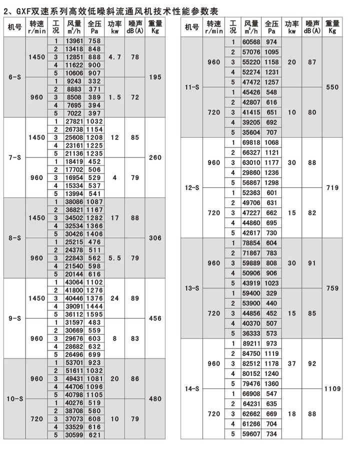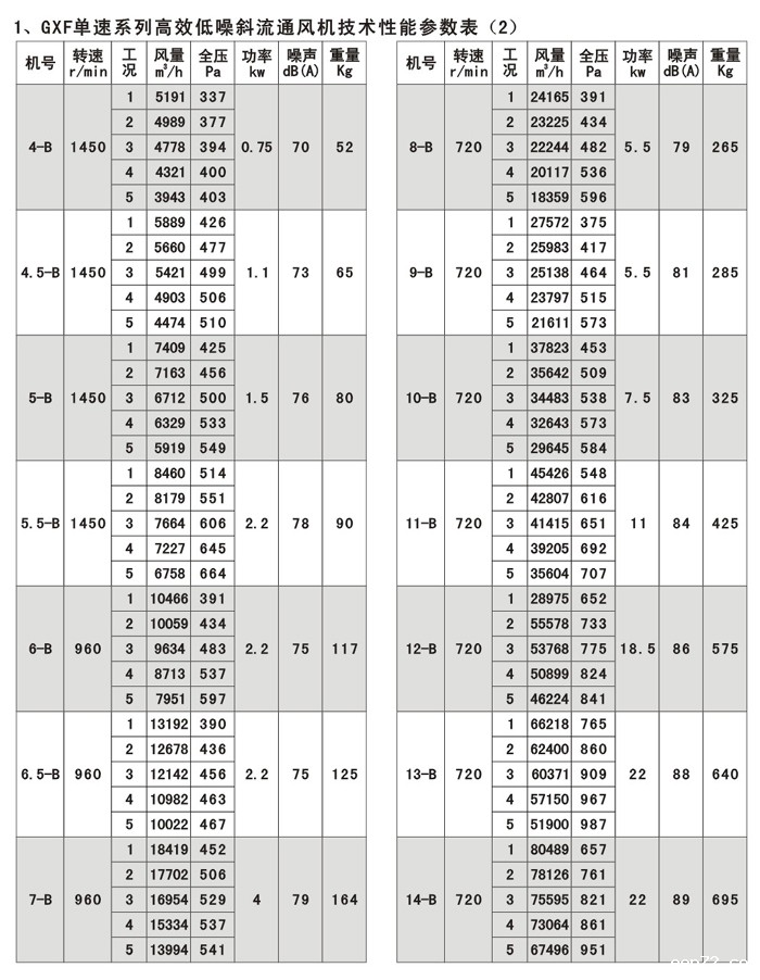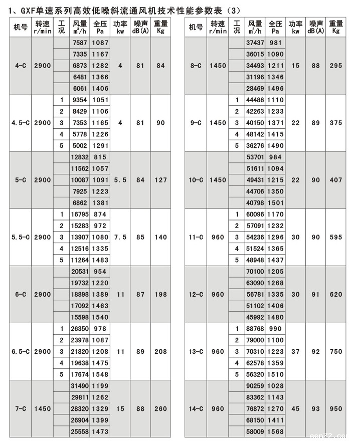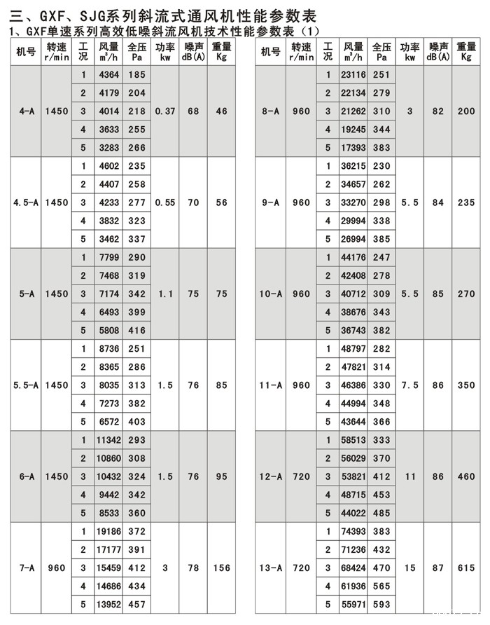GXF系列斜流通风机按叶轮直径分为400-1400mm十四规格,按类型分为A、B、C、D、S五种类型,共五十八个机号。风量由3000-90000m3/h,全压由185-2500Pa;这样就给设计部门和用户单位提供了充分的选择条件,具体数据请查风机性能参数表。