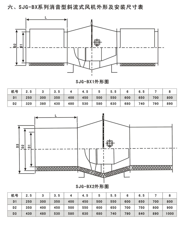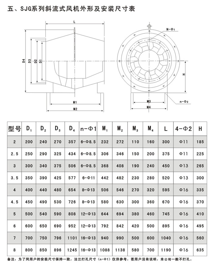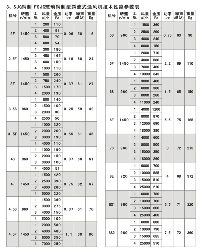 SJG系列斜流式通风机按叶轮直径分为200-800mm十几种规格、十几个机号,风量由200-2500m3/h,全压由50-1200Pa;具体数据请查风机性能参数表。
