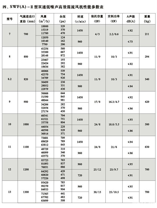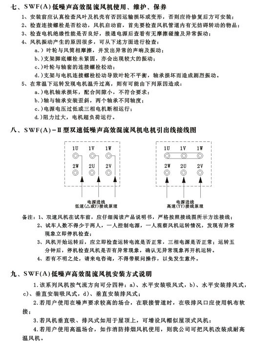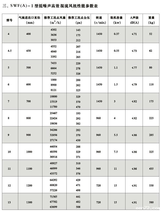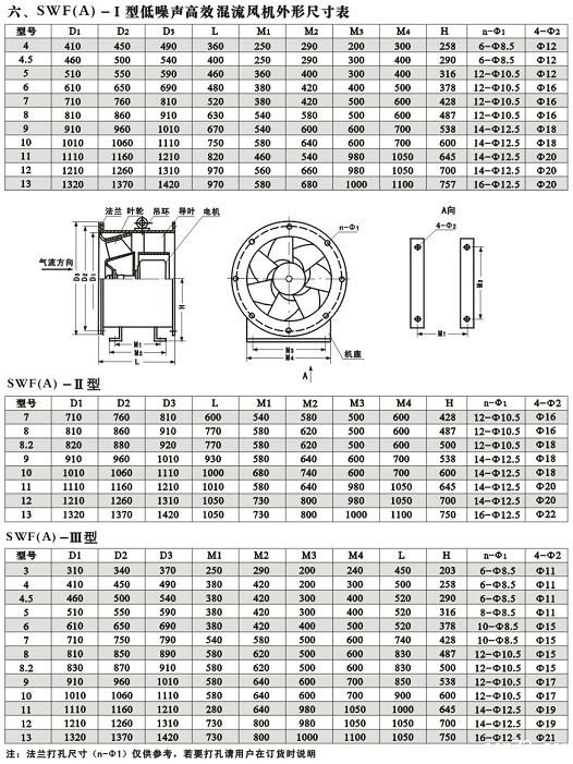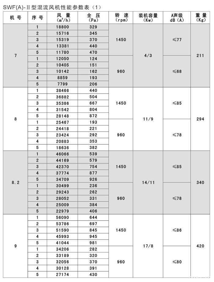 SWF(A)【HLF】系列低噪声混流风机针对目前通风空调系统中,经常出现的风机压力偏高而流量不足或流量偏大而压力不够的这种系统与风机不相匹配的情形,我们根据“准三元”理论和“子午加速”设计方法,研制成功比转数介于离心和轴流之间,压力系数高于轴流风机和流量系统高于离心的一种新型风机。因此,用户选型范围更为广泛,系统匹配更趋合理,有利于系统节能。它是目前通风机中最适宜管道加压系统的新型产品。